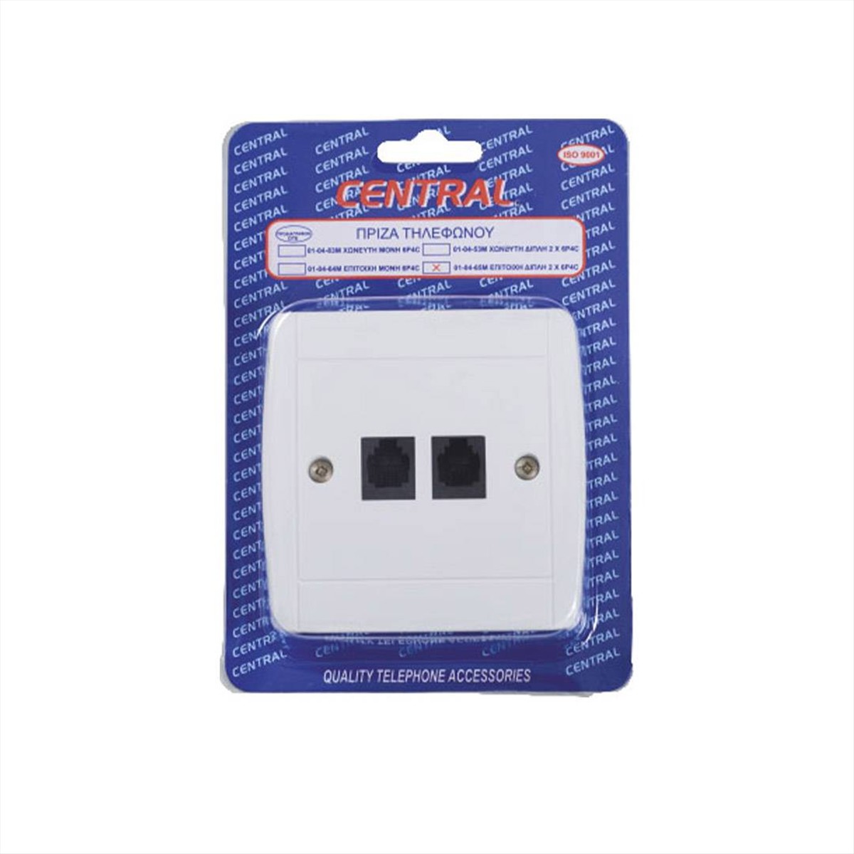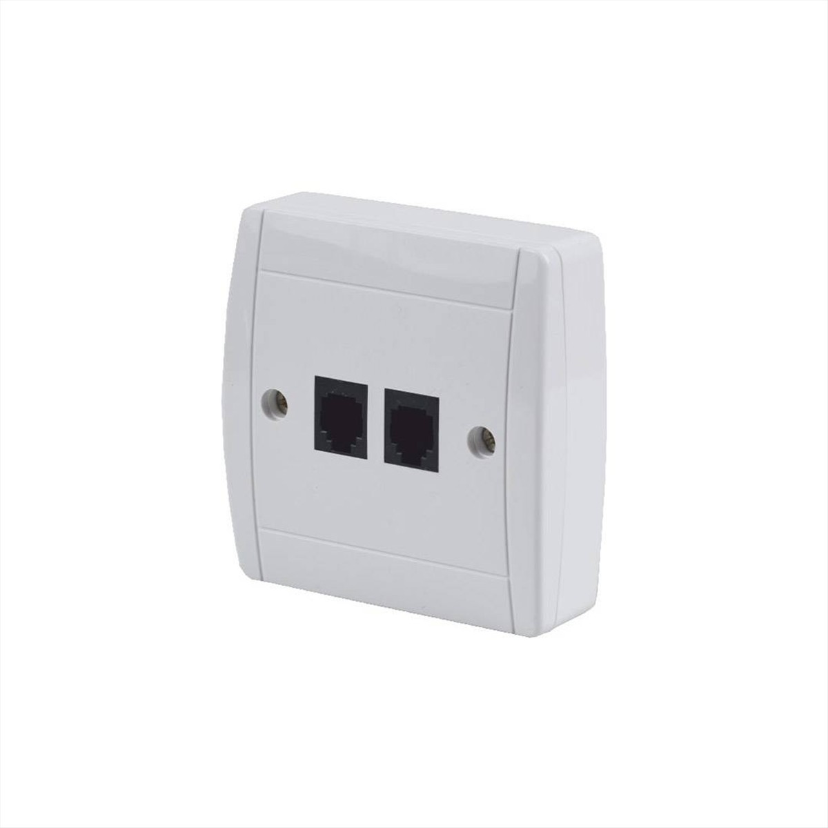 Πρίζα τηλεφωνική διπλή επιτοίχια 2xRJ11 6P4C λευκού χρώματος, ιδανική για οικιακή ή επαγγελματική χρήση. Η πρίζα διαθέτει πρόσοψη τύπου “Oval Type” με τυπωμένο κύκλωμα PCB, ενώ οι κλέμες σύνδεσης ασφαλείας εξασφαλίζουν σταθερή και αξιόπιστη επαφή. Περιλαμβάνει τάπες κάλυψης για τις βίδες και κουτί στήριξης για εύκολη επίτοιχη τοποθέτηση βάθους 18mm.