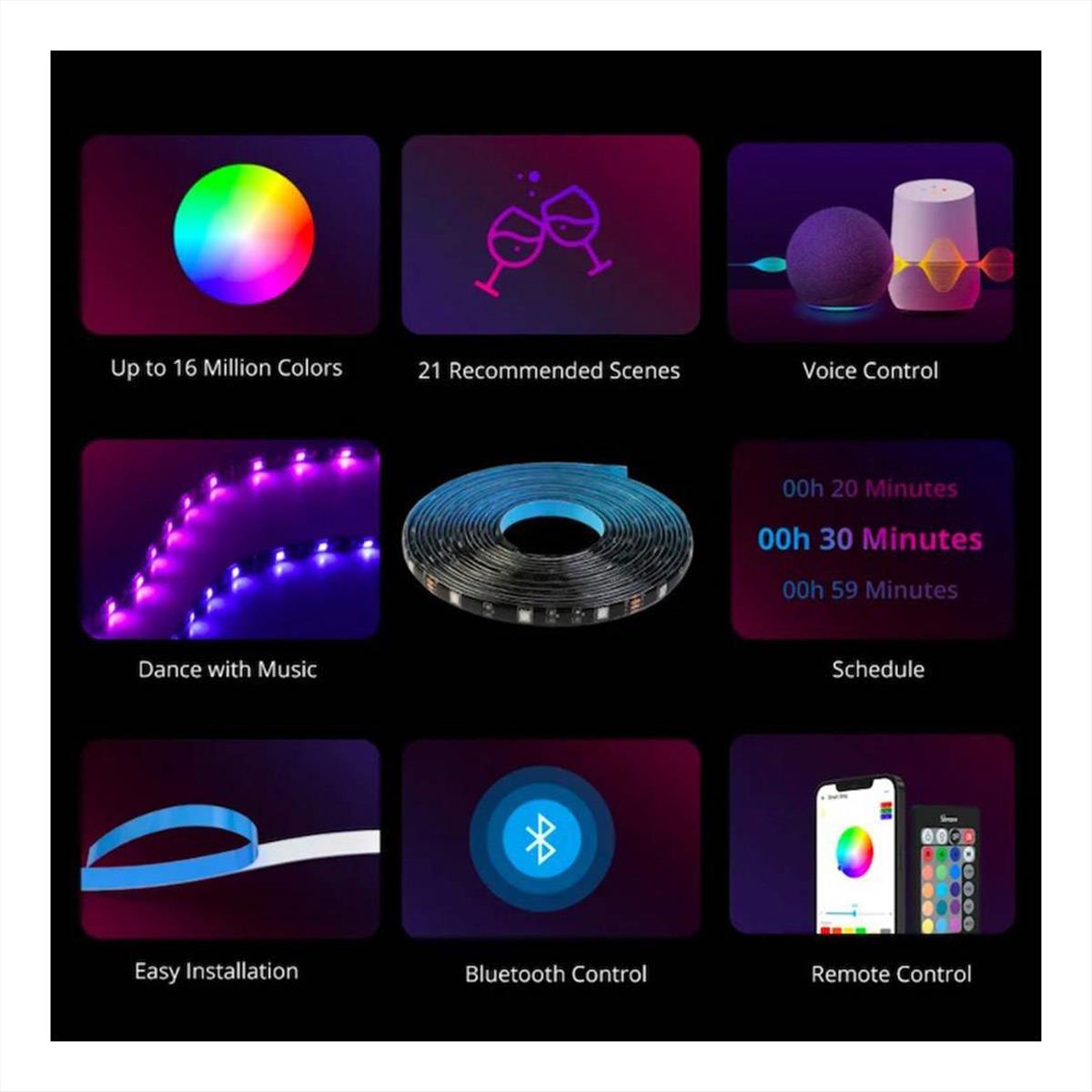 Η αδιάβροχη προστασία IP65 επιτρέπει την τοποθέτηση ακόμη και σε περιοχές με υγρασία, όπως μπαλκόνια ή πισίνες, ενώ η ισχυρή αυτοκόλλητη ταινία 3M εξασφαλίζει εύκολη και σταθερή εγκατάσταση. Μέσω της εφαρμογής, η ταινία υποστηρίζει περισσότερα από 16 εκατομμύρια χρώματα, 21 προτεινόμενες σκηνές και έως 8 προσαρμοσμένες λειτουργίες.